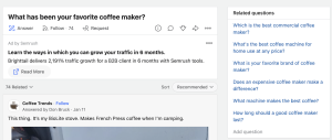 Quora has topics on practically everything you could think of and has a handy ‘related questions’ section on their web application. SEOs can use this section to find more keywords.