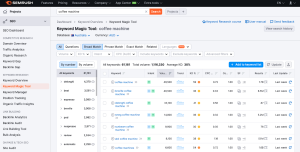 Semrush is an excellent SEO tool for marketers to track keywords, quickly discover inbound marketing opportunities, identify long-tail keyword phrases, run SEO audits, etc. Semrush has a nifty feature called the ‘keyword magic tool,’ making it a piece of cake to do keyword research and check for search volumes and keyword competitiveness.