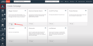 Pitchbox uses top SEO tools to fetch data, including Ahrefs, SEMRush, Majestic, and Moz. Go to the campaigns section in the Pitchbox dashboard and click on “Create” in the “Blogger Outreach” box as seen in the image below.