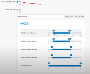 Install the MozBar when you are finding sites because this will help you pick sites above a particular DA range. MozBar will display metrics such as DA and PA on the search engine result pages so that you can select high-quality sites.
